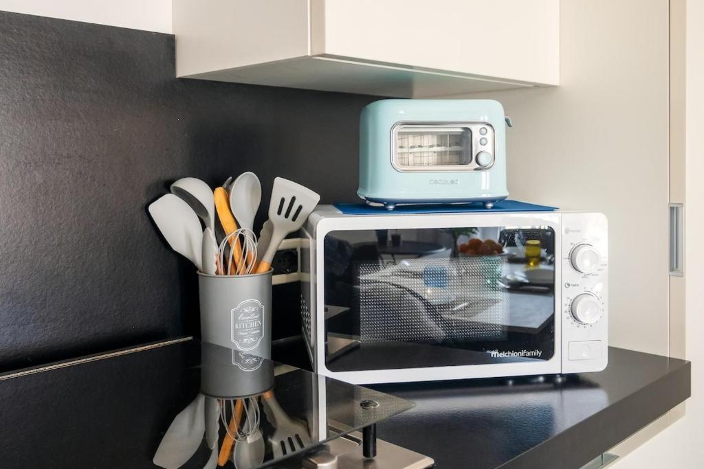 Stanza letto 1 matrimoniale. Poi una cucina soggiorno con un divano letto da una piazza e mezzo comodo anche per 2 adulti .