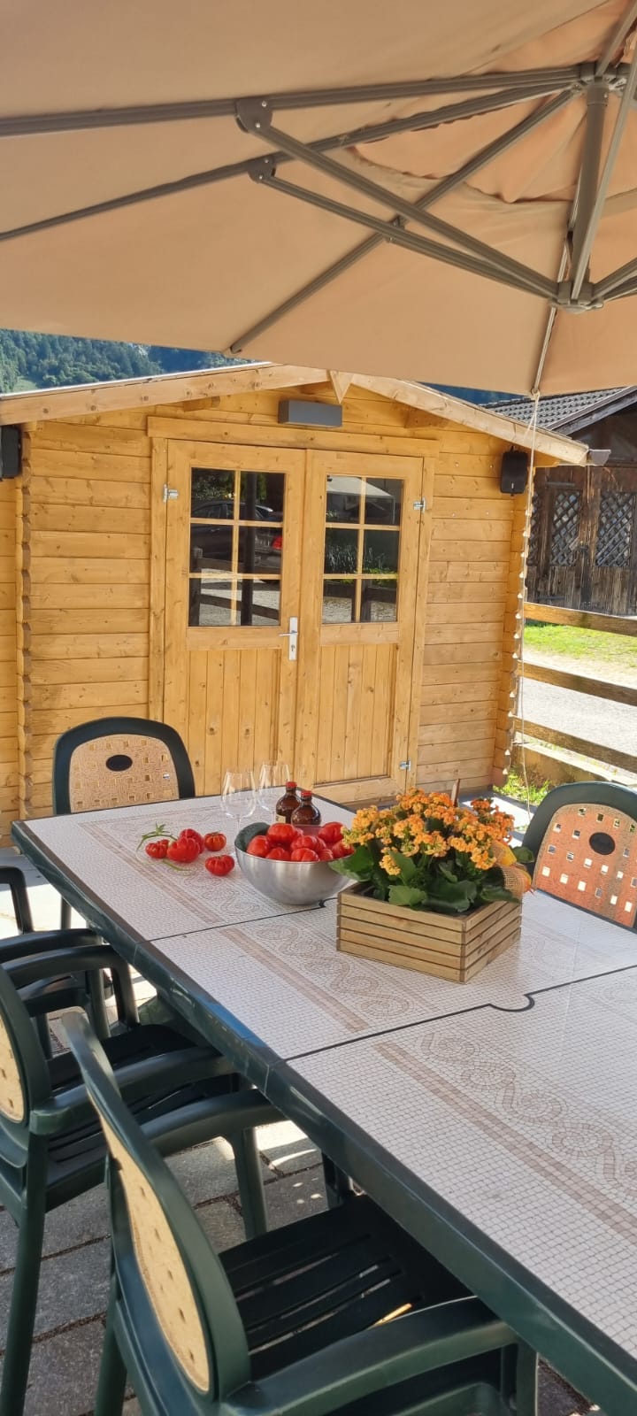 Heated storage for skis, snowboards, boots, and snowshoes – Zen garden – table for 12 people sheltered by a large umbrella – relaxation loungers – bench – wood-burning barbecue – gas barbecue – fountain